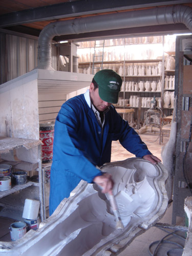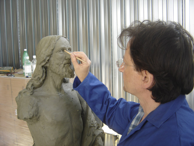 Da una semplice foto i nostri scultori realizzano su creta l'immagine della statua nei vari dettagli (altezza, postura, particolari del viso, abiti), si modella a mano creando gambe, braccia, testa, usando piccoli scalpellini, rendendola quanto più somigliante possibile con espressioni adatte. Una volta finita la scultura andiamo a creare lo stampo con materiale in gomma e contro forma in vetroresina per poter dare inizio alla produzione delle statue con materiale in gesso resina e vetro resina avendo cura di ripulire tutte le parti in eccesso, a richiesta si possono mettere occhi di vetro alle statue da cm. 60 in su.